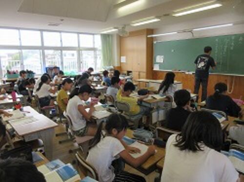 3年生の教室に入ると、黒板いっぱいに水彩絵の具で描いた絵が並んでいました。いろいろな色の線を使って表現した絵。近くで見るのと遠くから見るのとでは違った印象がありますね。何に見える?