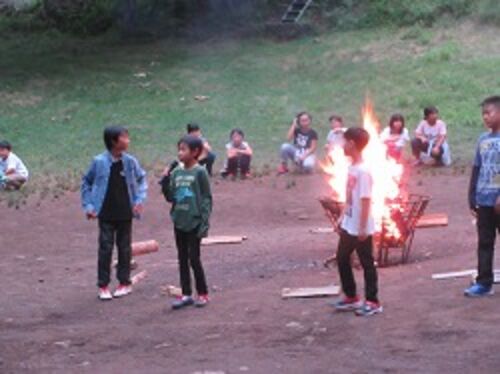 夕食後はキャンプファイヤー。みんなで会場のわんぱく広場へ移動しました。火の神からトーチに火を分け与えられた火の使いたちが中央のキャンプファイヤーに点火してスタート。子どもたちは最初の「コロブチカ」からノリノリで、「ABC」や「USA」と絶…
