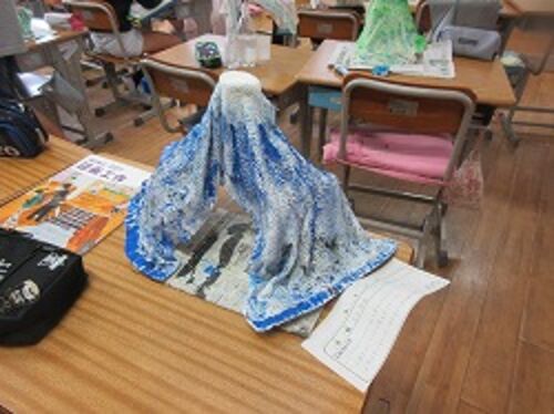 6年生が図工の時間につくっていた水粘土の作品が完成。教室に戻って鑑賞の時間です。工夫を凝らして個性的な作品ができたので、ただ見ているのも楽しいけど、タイトルがついていると「確かに」とうなづけるものも。