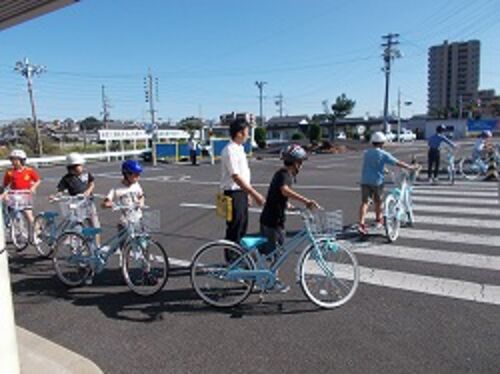 いよいよ教習コースでの自転車訓練です。自分のヘルメットをかぶって、自転車でスタート。ポイントごとに教習所の方が立って指導してくださいます。ジグザグ運転をしたり、止まっている車を追い越したり、信号交差点、クランク、S字、坂道、踏切、そして、子…