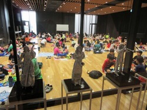 最初に芸術劇場に到着したのは、バスの先発組1年生と2年生1クラス。芸術劇場に入るのは初めてという子もいる1年生はきょろきょろしながら入場。エスカレーターで会場へ向かいます。