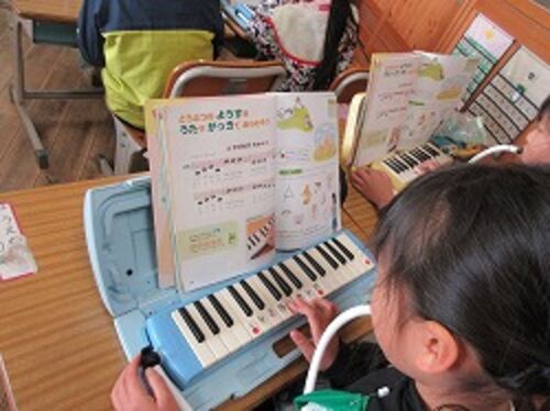 1年生の音楽は、鍵盤ハーモニカの演奏練習です。全員が音を出すとすごい音量です。でもみんな演奏は大好きらしく一心不乱に弾いています。先生から、手の形や指の置き方などを教えてもらい、一斉に。