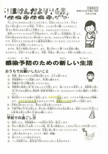 昨日「保健だより」を配付しました。すでにお手元にあるかとは存じますが、感染症拡大防止のための、新しい生活様式は学校でも、これまでにない形での行動などが求められます。ご家庭に協力いただきたいことは「おうちでお願いしたいこと」に書かれています…