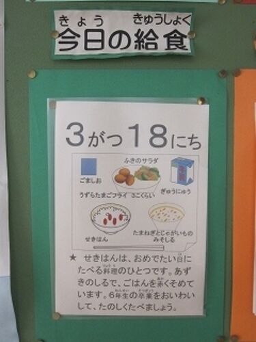 今日は6年生にとって最後の給食です。1階配膳室前の給食コーナーには、今月の給食についての話題とともに、1年間に何回給食を食べたかという数字がありました。今日の6年生の給食は178回目。5年生以下は、来週の月、火曜日も食べるので180回だそ…