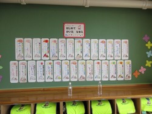 1年生が初めて書いた名前が教室の背面掲示板に貼ってあります。クレヨンの色々な色で書きました。金曜日の授業参観では教室に入っていただくことができないため、ここに掲載します。ご了承ください。