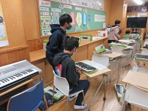 6年生は音楽で「LOVE」という曲で、グループごとにアンサンブルを作っているようです。来週は発表と言うことで、楽譜を見ながらみんなキーボードに向かっていました。