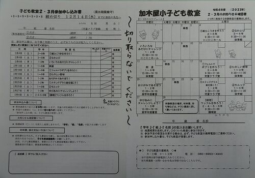 本日、こども教室の2月・3月の募集案内をお届けしました。 剣道や低学年向けの野球など、魅力的な活動が目白押しです。 締め切りは、12月14日(水)までに、担任の先生へ。気になるものがあれば、お早めにどうぞ!