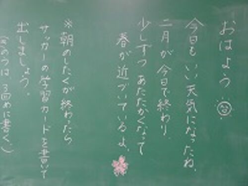 雨降りで気温も上がらず…肌寒い一日となりました。 廊下を歩いていると… 「6年生を送る会」を案内するポスターが登場しました。 また、5年生の教室の「朝の黒板」にも… 「6年生を送る会」まであと1週間です。 6年生を送る会には、1~5年生の子どもた…