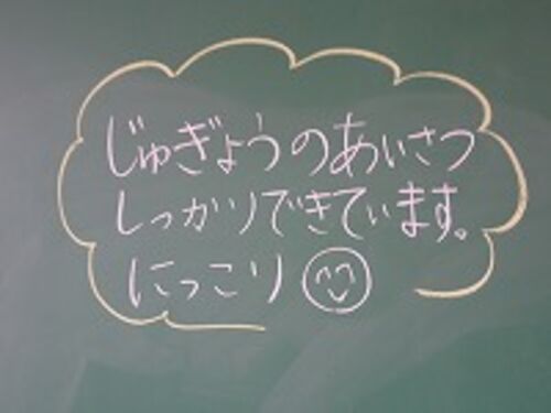 朝、校内を歩いていると…こんな黒板が… うれしくなります。 1時間目の1年1組前のようす… 子どもたちが水やり中。担任の先生は、ちょっと離れたところにいたのですが… 先生がいないと、みんなお友達と、「芽が出ているね」「二つもあるね」なんて、水やり…