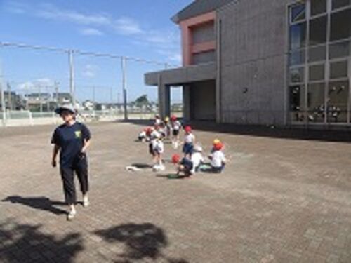 10月6日(金)週末、気持ちのよい秋晴れの日でした。 1-4の子どもたちが、シャボン玉遊び… 今日も、シャボン玉には少々風が強かったでしょうか。 運動場では、2-2が体育の授業。「ボール投げ」ゲーム。 円の中と外のチームに分かれて… 外のチームは…