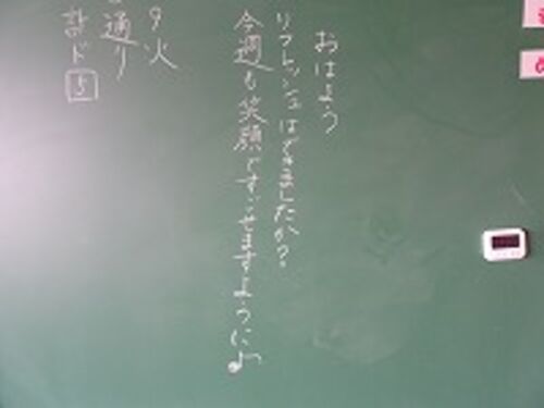 新しい週が始まりました。 このクラスには… 転入生があったようですね。新しい仲間、みんなで楽しい学校生活を送りたいものです。 こちら…1-1の先生がご自宅から持って帰ってきたアサガオ… よく見ると… カマキリが!(保護色ですね…) 2時間目の1-1は…