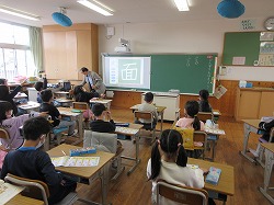 2021-04-14 3年生:漢字の書き順 3年生 3年生が漢字ドリルの漢字を練習しています。先生が黒板に貼ったスクリーンに映しだしたのは、漢字が一画一画実際に書くように映し出されたもの。書き順がとってもわかりやすいですね。それを見ながら空書きして、ドリルに練習していました。