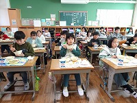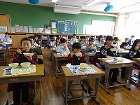 2023-01-16 今日の給食 給食 3年生 4年生 今日の給食は、わかめご飯、いわしのしょうが煮、ハムと野菜のサラダ、玉ふ汁、牛乳でした。 3年生と4年生の給食の様子です。 いわしはしっかりと加圧されているので、骨まで柔らかくなっています。子どもたちの中で魚=骨をとる、骨がささる点がマイナスポイントになっている子が多いようです。そのため、「魚は苦手だけど、このタイプは好き」という児童が多くいます。甘いたれがかかって、味がついているので、ご飯がよく進むおかずです。
